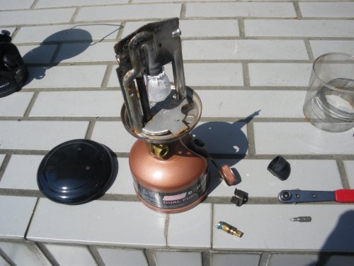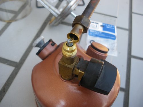 で、どう壊れているかというと、つまみを回すとガソリンがつまみのあたりからポタポタ漏れる。マントルの方にはガソリンは行かない。マントルに火をつけようとしても当然点かずに、そのうちにつまみのあたりに引火してランタンの外側に火が付く。テント内だったら大変な事。まぁこのくらいのことはアメリカンな製品にはありがちだと思ってます。はい。